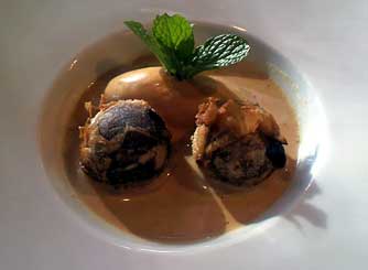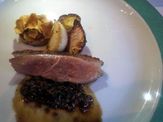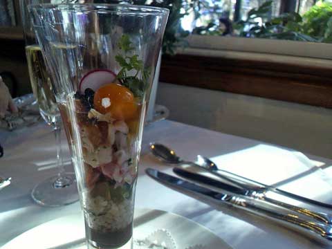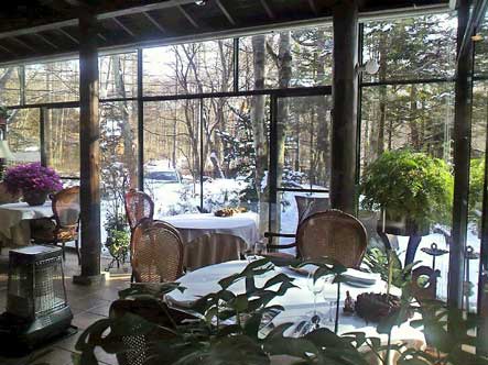 ここのレストラン、誰かの別荘か何かをそのままレストランとして使用している感じで、ダイニング、暖炉のあるリビング、写真のテラスと、それぞれお部屋が分かれていて、ヨーロッパ系高級家具が客席用に配置されていてとても格式の高い内装。